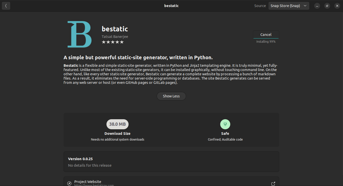 If you are using Ubuntu or one of the flavors of Ubuntu (such as Kubuntu, Xubuntu, Lubuntu, Ubuntu Budgie, etc.), the Snap version of Bestatic should be available to out-of-the box from your software center or Snap Store. You should just search for bestatic, click install, provide sudo or root password if asked and you should be done. Screenshots are provided below for reference: