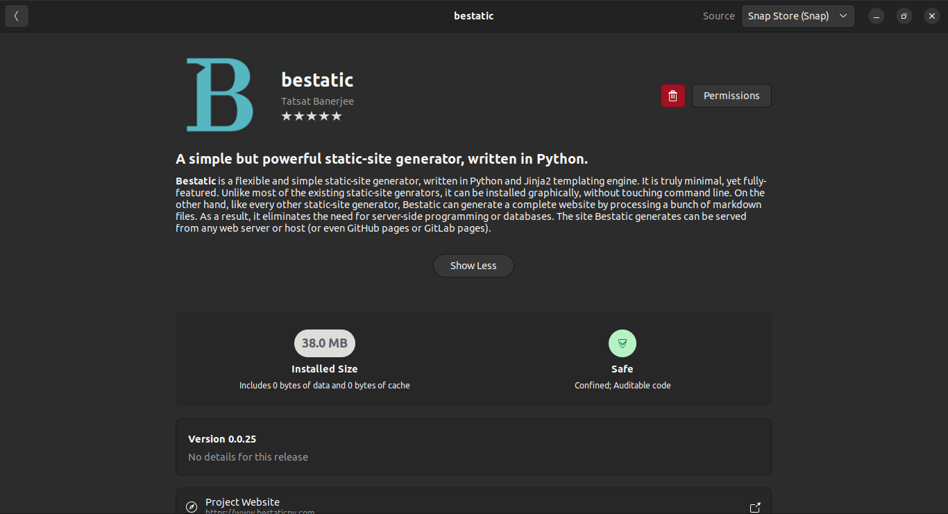 If you prefer command line, please just use sudo snap install bestatic to install bestatic. If you are on another distro and snapd is not installed by default, you can install snapd from the command line following distro-specific instruction available here. You can then install bestatic by using the same command provided above, as also documented in the Snapcraft documentation for Bestatic.