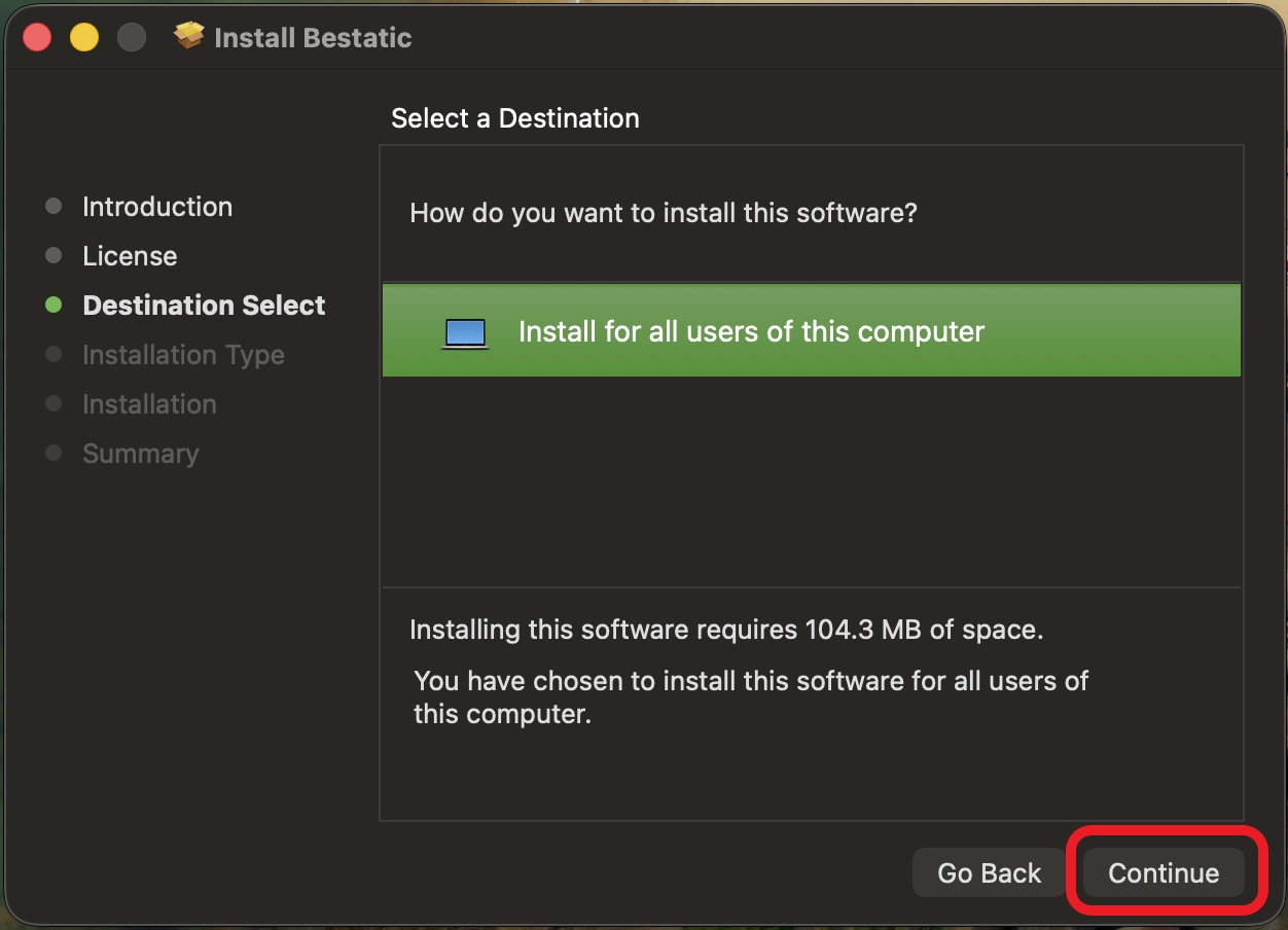 If you prefer CLI, you can use Homebrew and pipx to install bestatic. Commands are provided below. Note that, instead of using the first command, you can also use .pkg installer (available here) to install Homebrew and use the remaining commands.